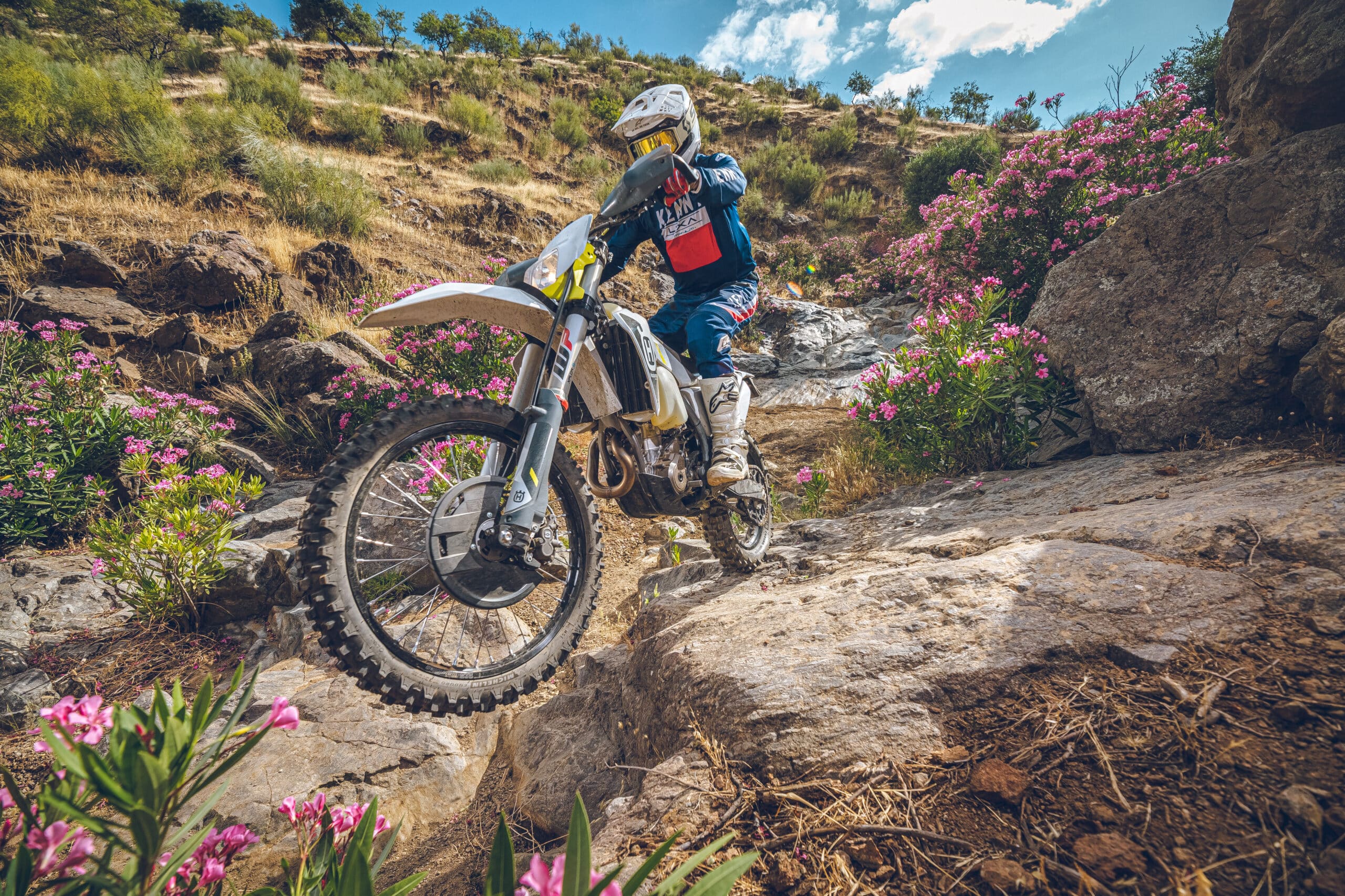 Pas le temps de réfléchir, on jette l’équipement dans la valise. Et quelques coton-tiges dans le nez plus tard, nous voici au cœur du Jarvis Land à quelques pas de Malaga. La légende britannique nous accueille en personne, accompagnée du non moins talentueux pilote Husqvarna Factory Billy Bolt. Comme si le petit coup de pression d’être encadré par des types évoluant sur une toute autre planète enduro que la nôtre ne suffisait pas. La découverte des 300 TE et 350 FE mises à notre disposition annonce la couleur.
