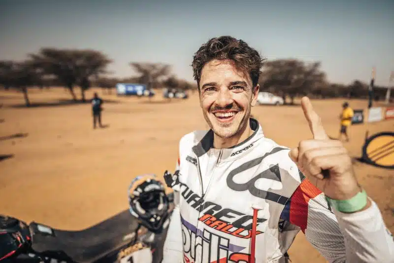 Les étapes finales, disputées dans les dunes de l’Erg Ouarane, ont permis aux pilotes de préparer à l’arrivée traditionnelle au Lac Rose à Dakar, au Sénégal, le 12 janvier. Jacopo Cerutti a remporté la catégorie moto, suivi de près par Alessandro Botturi, avec un écart de seulement 26 secondes après 6000 km de course. Botturi paraissait avoir les choses en main quand des filets en plastique se sont coincés dans sa roue avant, ce qui l’a largement ralenti. Avec 26 secondes de retard à l’arrivée, on peut considérer que cette mésaventure lui a certainement coûté la victoire.