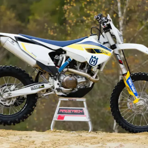 La grosse Suzuki RMZ-E 450 2015 se dote à son tour d’une fourche à air, une Showa en l’occurence, sur...