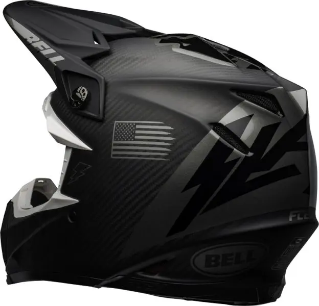 Côté design, ce Bell Moto 9 Flex Slayco s’aligne sur une gamme sobre avec des tons noirs et gris. Afin de rappeler l’origine de la marque Bell mais également celle de Slayco, on retrouve des deux côtés du casque un drapeau américain. Cette collaboration est signée : sur le haut de la calotte, un sticker du logo Slayco est collé pour un look encore plus jeune et défiant les limites.