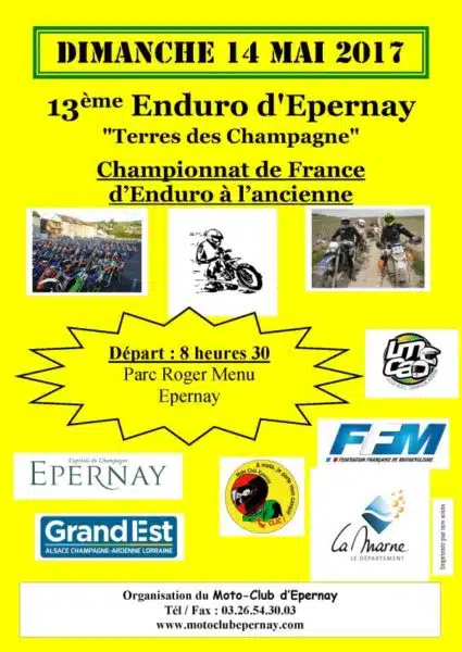 Pour sa 13e édition, l’enduro d’Epernay Terres de Champagne servira de support au championnat de France d’enduro à l’Ancienne les 14 et 15 mai prochains. Départ et arrivée prendront place à Epernay. Le parcours de liaison fera environ 70 km. Deux spéciales sont prévues.