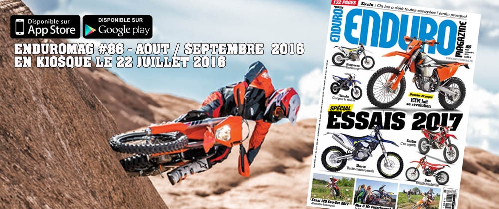 KTM, Sherco, Beta, Gas Gas, toutes ces marques sont déjà présentées et essayées dans Enduro Mag 86 ! HVA et Yamaha sont aussi à l’honneur avec les premières images de leurs versions 2017. 132 pages ont été nécessaire pour vous révéler tout ce que vous vouliez savoir sur votre prochaine moto. La 125 Evo-Set, alternative aux feu 125 KTM et HVA est testée, on vous fait découvrir une course hors norme en Bourgogne, l’Enduro Top, rentrer dans l’intimité du couple Peterhansel, partager la première édition des Enduro Mag Days, revenir sur la sport en GP, France, Family, Trèfle… Votre livre de chevet de l’été !