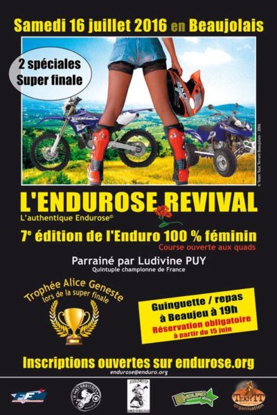 Le Team Tout Terrain Beaujolais, fondateur de l’Endurose, 1er enduro 100% féminin au monde, organise la 7ème édition de son épreuve le 16 juillet prochain : L’Endurose Revival 2016.