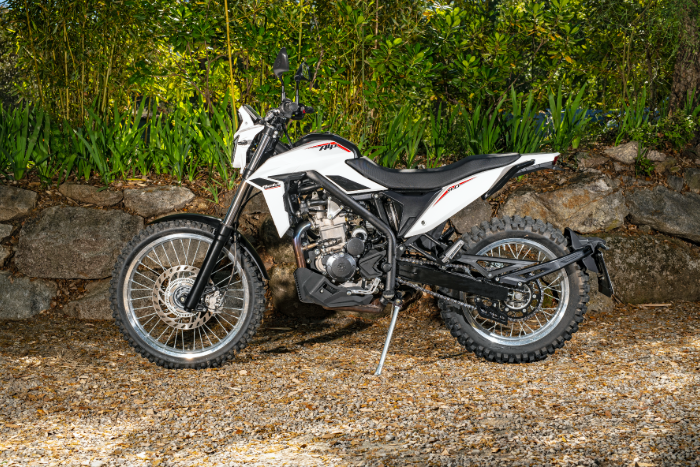 Sur les routes sinueuses du massif des Maures, la moto enchaîne les virages avec une maniabilité bluffante. Légère, courte, stable : un vrai vélo. Le freinage est à la hauteur, avec à l’avant un ensemble Nissin issu des modèles enduro racing de la marque, et à l’arrière un Grimeca efficace et progressif.
