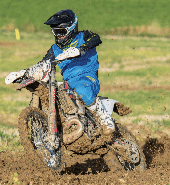 Et voici donc comment je me suis retrouvé au guidon d’une Rieju 300 MR Racing, soit, concrètement, la même moto qui s’appelait GasGas 300 EC en 2019, lors des derniers EMDays. Une machine moderne, puisque redesignée totalement en 2018. Et fichtrement bien équipée, avec notamment ses suspensions KYB à l’avant comme à l’arrière. Freins Nissin avec disques NG, guidon Neken sans barre, pneus Michelin d’origine avant/arrière montés sur des jantes Excel, échappement FMF… On est loin d’être sur du produit low cost, encore une fois. Une fois grimpé en selle, on retrouve avec plaisir un poste de pilotage tout ce qu’il y a de plus actuel. Le guidon sans barre est bien dessiné. La selle bien plate permet de se mouvoir aisément d’avant en arrière. Et le triangle formé par l’ensemble guidon/ repose-pieds/selle offre une position naturelle.