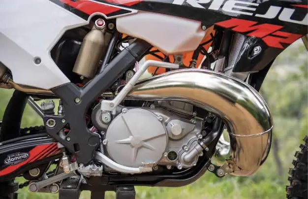 Le démarreur est à gauche, perdu au milieu d’un commodo un poil disgracieux, comme avant, qui ressemble à celui d’un mauvais scooter chinois. Pas un drame paysan, comme dirait le Rodo, mais ça tranche avec le reste de la bécane, plutôt classieuse. Mais au moins, le démarreur fait le boulot, dans un bruit certes un tantinet métallique, une marque de fabrique ! Parmi les dernières résistantes en 2T à garder un carburateur (avec Beta et Sherco), le fameux Keihin PWK, la Rieju donne tout de suite à voir, dès les premiers tours de roues, quelque chose que vous êtes nombreux à rechercher : du caractère. Vrai qu’avec 300 cm3 et un carburateur, on n’en attend pas moins d’elle. On retrouve ainsi le gros couple du bloc dès les bas-régimes.