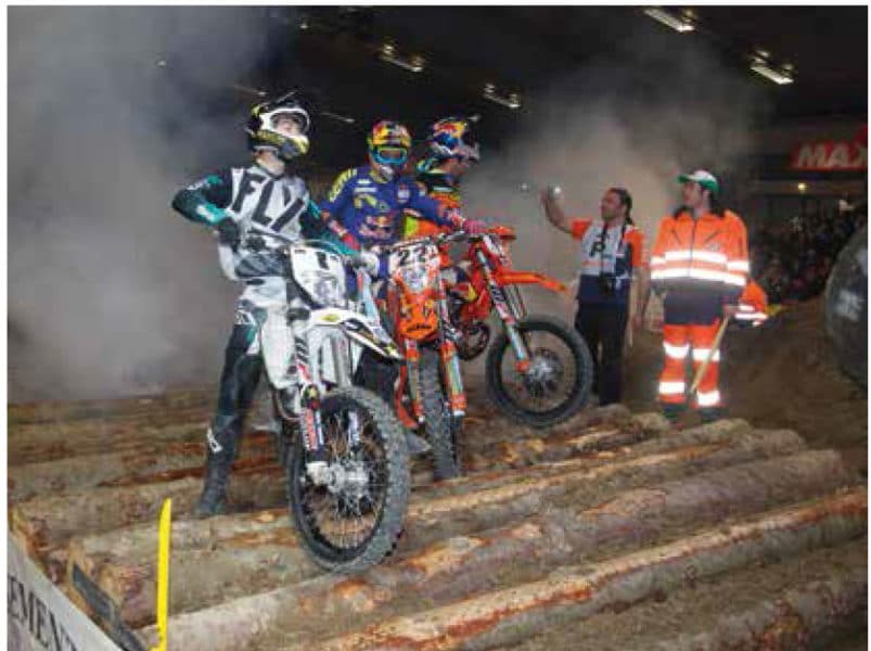Si Walker, Roman, Gomez ou Littenbichler participent avec autant de réussite au SuperEnduro, eux les spécialistes des extrêmes naturelles, c’est bien qu’il doit y avoir une filiation, non ? A Albi, la piste était particulièrement réussie. ABC Communication n’avait pas hésité, devant l’absence de postulant au rôle d’organisateur de la finale, à endosser la fonction avec le MC du Circuit d’Albi. Pour l’occasion, c’est Sébastien Fortanier, voisin mais aussi mécanicien de Walker, qui avait dessiné et réalisé la piste avec un entrepreneur local. Eh bien figurez-vous qu’elle a été élue meilleure piste de la saison par les pros ! Le Parc des Expos était super bien exploité malgré son format boîte d’allumettes, avec des obstacles pas trop hauts pour ne pas boucher la vue. Surtout, les enchaînements étaient rythmés et le pierrier donnait quasi systématiquement lieu à des revirements de situation enchaînés par des remontées tonitruantes. Les Tambours du Bronx ont assuré un show qui a fait leur renommée internationale, les pom poms suivent la série toute la saison, bref, c’était canon.