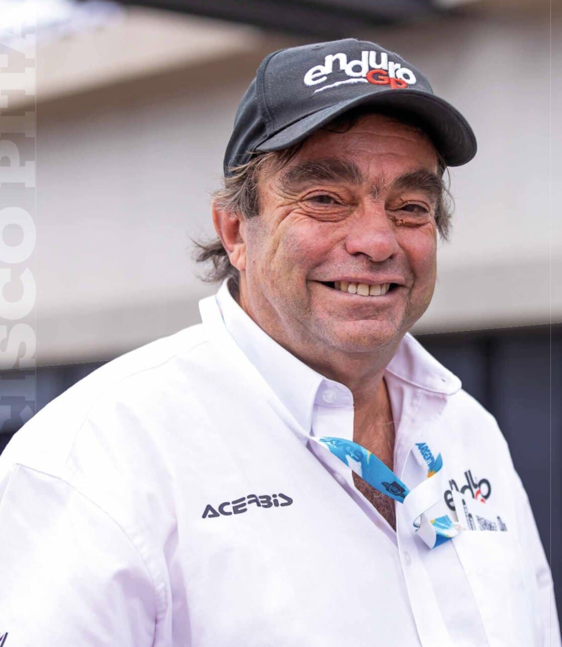 Eh bien, je m’appelle Francisco Pita. Je suis né à Lisbonne au Portugal il y a 65 ans. Je suis père d’un fils de 24 ans qui a été un joueur de tennis de bon niveau puisqu’il a intégré le top 400 mondial avant de devoir arrêter sa carrière à la suite de quatre opérations. J’ai déjà participé au Dakar en tant que journaliste, et pilote voiture. Quant à Prime Stadium, c’est une société impliquée dans le sport et l’événementiel depuis pas mal d’années maintenant, qui, lorsque la Fédéra- tion Internationale de Motocyclisme a lancé un appel d’offre pour l’organisation du Championnat du monde d’enduro, y a répondu. Et l’a remporté. C’était au début 2022, ce qui signifie que nous sommes à la fin de la seconde année de notre prestation.