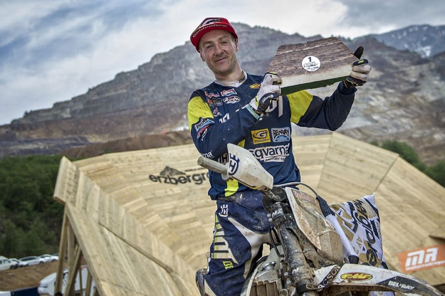 Aussi étonnant que ça puisse paraître, ce n’est « que » la troisième fois que Graham Jarvis remporte la plus prestigieuse des classiques d’enduro extrême, j’ai nommé l’Erzberg Rodéo. Et encore, j’inclue la victoire « collective » de l’an dernier. Cette année, pourtant, l’Ecossais, privé de son meilleur ennemi Jonny Walker insuffisamment remis de sa blessure à la jambe, n’a laissé planer aucun doute sur sa victoire. Parti comme à son habitude prudemment, il n’a mis qu’une demi-heure à déposer un à un ses rivaux, avant de s’échapper du pierrier de Carl’s dinner comme s’il était sur une autoroute. Du coup, il termine plus de 30 minutes devant l’américain Cody Webb. Un Webb qui signe ainsi une immense performance, pour sa deuxième participation seulement, en dépassant l’Espagnol Alfredo Gomez juste avant la fin de course, dans « Lazy Noon’, une grimpette chère où nombre de tops, dont Blazusiak, Young, Bolt ou Roman ont eu beaucoup de mal à franchir. Gomez, victime d’une grosse chute en début de course, peut tout de même être satisfait de ce podium acquis dans la douleur. Roman, 4e, et le jeune Billy Bolt, 5e, prouvent une nouvelle fois que la seconde génération d’extrémistes est en route, et va vite venir chatouiller les barons en place !