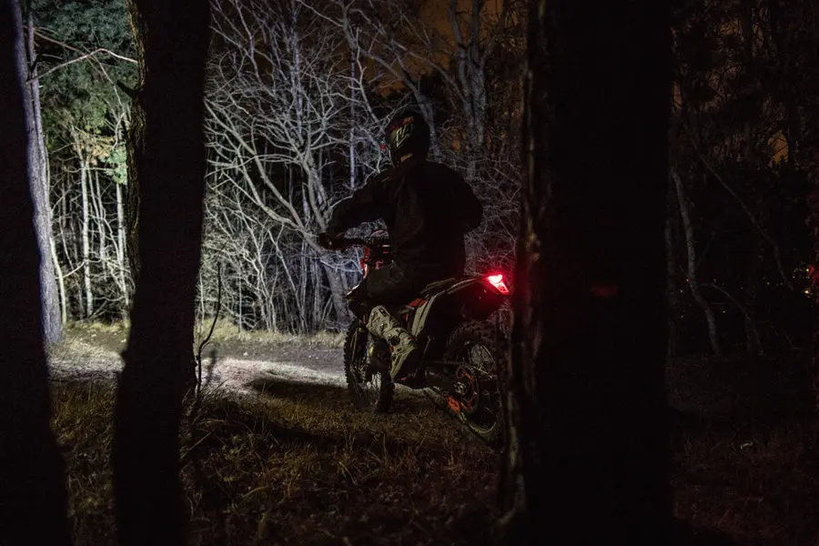 On passe aux choses sérieuses en termes d’éclairage avec la Helios. Dernier modèle du fabricant auvergnat Klorophyl Light, ce produit a le précieux avantage de se faire bien plus discret et compact que les plaques phares alu/carbone qui avaient jusque-là fait les heures de gloire de la marque. Seul bémol notoire, le bloc optique arrondi en aluminium étanche semble bien costaud mais il vient dépasser du plastique de la plaque et s’offre plus volontiers aux impacts, ce qui lui vaut de perdre deux étoiles au chapitre « Incorporation dans la plaque ». Dommage car sans cela elle obtenait la meilleure note de ce test. À noter que le « plug and play » ne s’offrira qu’aux modèles injectés. Pour les autres, l’achat et le montage d’un redresseur sera nécessaire. 69 euros le boitier IEG. En action, rien à voir avec la RTech, il m’est désormais possible d’attaquer fort sur la boucle d’essai mêlant technique et rapide. Le faisceau lumineux est très blanc, plus que ses concurrentes, notre fabricant tricolore ne communique d’ailleurs pas sur la température de couleur offerte par la Helios. Aucun problème sur cet essai, mais possiblement gênant dans des conditions poussiéreuses ou humides où la réverbération des feuilles viendra occulter certains détails du terrain là où une teinte plus jaune serait plus appréciable. Mais la Helios reste le meilleur rapport qualité/prix pour ceux qui souhaitent prolonger le plaisir jusqu’au bout de la nuit, en rando ou en compétition, et surtout la solution qui peut s’appliquer à presque toute les 2T actuelles, injectées ou pas, moyennant un surcoût.