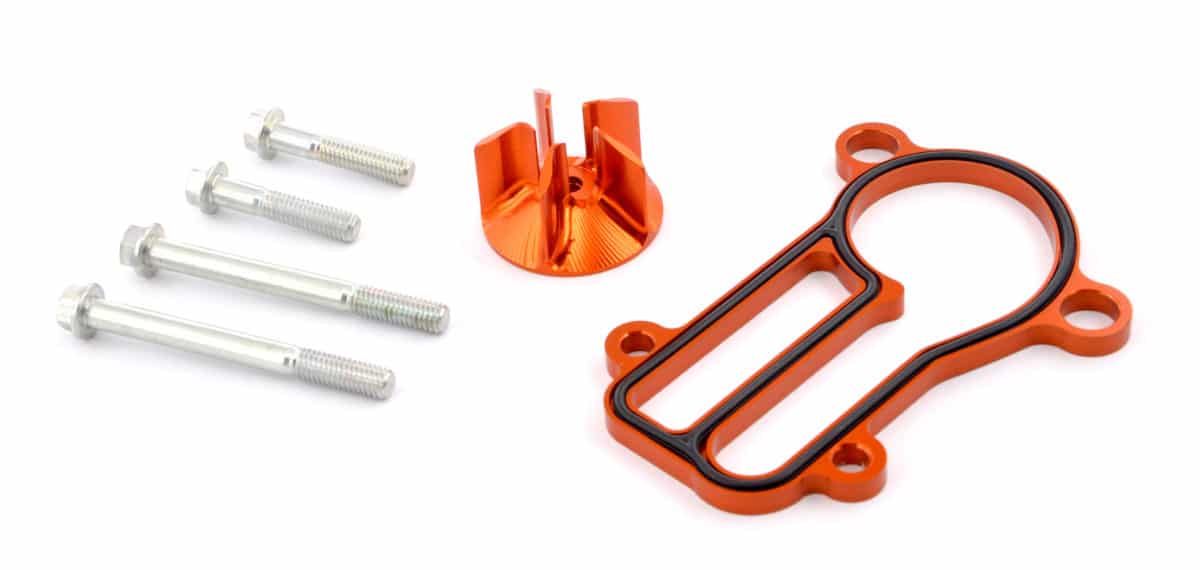 Malin, ce kit de pompe à eau augmente le débit de liquide dans le système de refroidissement, ainsi que la capacité du circuit de refroidissement. En plus, il a été conçu pour éviter le phénomène de cavitation qui pourrait engendrer des bulles d’air dans le circuit. Fabriqué en alliage d’aluminium 6082, le kit comprend une turbine haut débit , une cale pour le couvercle de pompe, un joint torique et 4 vis. Disponible pour KTM et Husaberg 2 T de 2004 à 2014.