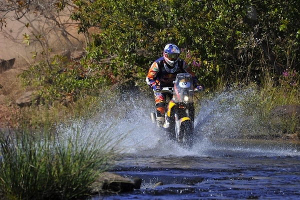 Avec 363.85 km de spéciale et 585.30 km au totlan, la 4e étape du rallye Dos Sertoes était la plus longue de l’épreuve. Paulo Gonçalves (Team Honda HRC), tenant du titre, l’a emporté en 4h24min02s, devant l’Espagnol Marc Coma (KTM Red Bull Factory Team) -en photo, ©RallyZone Bauer/Barni-, qui reste en tête du général pour 2min04.