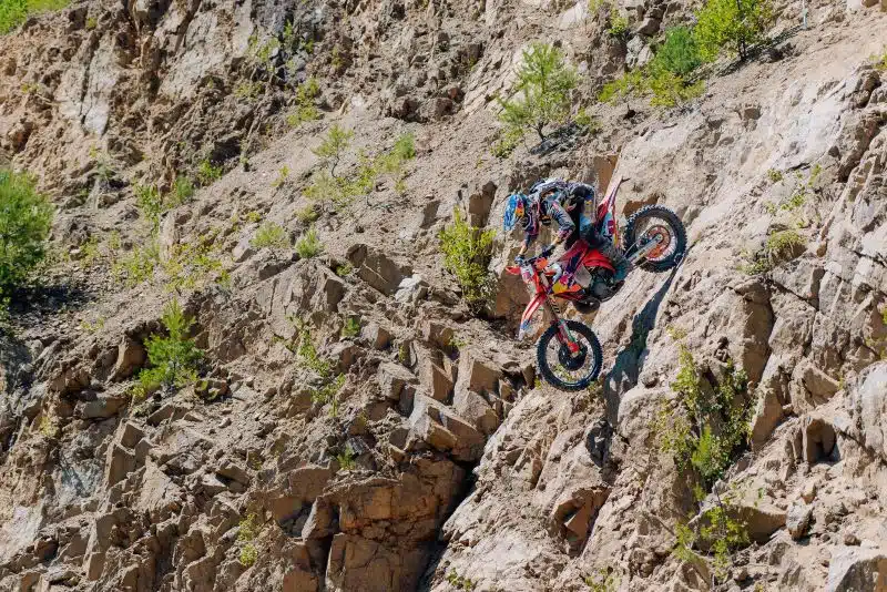Après une liaison routière de seulement six kilomètres, les pilotes ont très vite été plongés dans le vif du sujet, avec des classiques du parcours comme Galindo’s Ridge mais aussi de toutes nouvelles sections introduites pour 2025. Et dès les premiers kilomètres, les choses ont tourné au chaos, à commencer par la descente vertigineuse baptisée Sky Dive. Une section dénoncée à l’arrivée comme dangereuse par les pilotes. « Martin (l’organisateur) nous a un peu surévalué sur ce coup-là » a ainsi déclaré Manuel Lettenbichler au micro. Voir la vidéo ici. Mitch Brightmore y a d’ailleurs laissé des plumes, sa moto dévalant la pente en tonneaux sous les yeux incrédules de Mani Lettenbichler et Billy Bolt.