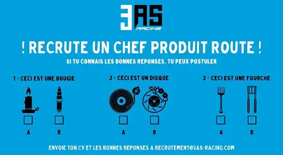 3AS RACING RECRUTE UN CHEF PRODUIT ROUTE Vente en ligne équipements et accessoires moto. Poste à pourvoir dès maintenant 39h...