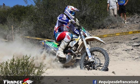 Vexé d’avoir pris une minute de pénalité mercredi soir après avoir connu un problème technique lors de la séance de mécanique, Loïc Larrieu a signé tout au long de la journée d’hier de sacrées performances entraînant dans son sillage ses trois équipiers de l’Équipe de France Trophée Junior. Dans les onze premiers des cinq spéciales du jour, avec en point d’orgue deux places parmi les quatre premiers, Loïc assume à merveille son statut de capitaine et montre l’exemple à ses jeunes équipiers qui découvrent cette épreuve. Champion de France Junior et Vice-Champion d’Europe 2014 dans la discipline, Jérémy Carpentier est entré parmi les trente premiers du scratch. «Ce fut une bonne journée pour moi. Je n’ai fait qu’une erreur dans la spéciale n°4 sinon mes temps chronos étaient bons. J’ai joué avec la moto. On gagne la journée ce qui nous permet de reprendre la seconde place du classement provisoire en Trophée Junior. Maintenant, il va falloir gérer les deux derniers jours de course et voir si on peut refaire notre retard sur les Américains. Aujourd’hui, les organisateurs avaient allégé le parcours après la difficile journée de mercredi. Ils ont bien fait car avec la chaleur ce fut encore compliqué.» analysait en fin de journée le poulain de Michel Mérel.
